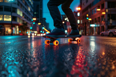 A skilled skater dances under city lights as rain-soaked pavement reflects colorful hues. The atmosphere buzzes with urban energy at dusk, creating a captivating moment of freedom and movement.