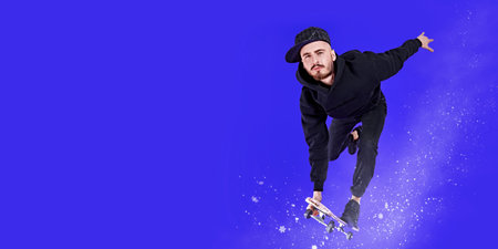 Winter activities. Cool young man rides and does tricks on a skateboard. Studio portrait on a blue background with snow and copy space.