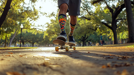 A casual scene of a man wearing funky socks while skateboarding in an urban park