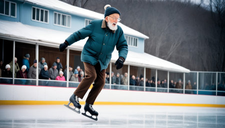 An elderly man in a teal jacket and brown trousers exudes vitality, ice skating with a look of excitement.. AI Generation