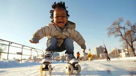 A young child boy is riding a roller skates down a road. The child is happy and smiling. Concept of joy and excitement as the child enjoys the thrill of rollerskating