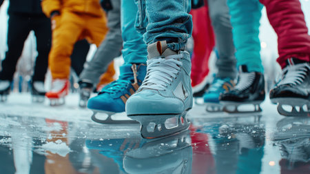 A group of people are skating on ice, wearing blue and white shoes. Scene is lively and fun, as the people are enjoying themselves on the ice