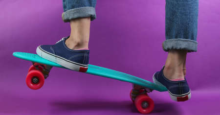 Youth hipster concept. Female legs in jeans and sneakers on cruiser board in the studio on purple background. Summer fun