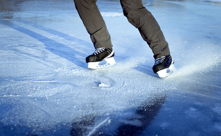 Ice skates in Motion Top View Closeup on white ice. Legs in jeans on the black skates. Amateur sport. Winter entertainment