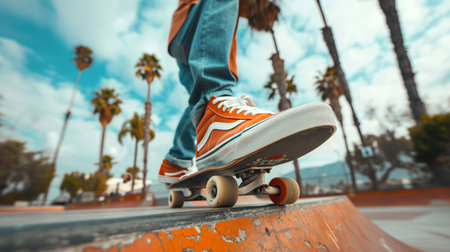 Close-up of a skateboarder's feet on a skateboard at a sunny skate park with palm trees.