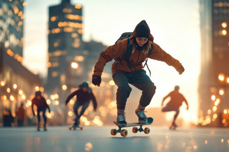 A group of skateboarders showcase their skills in a bustling city at sunset, surrounded by glowing buildings.