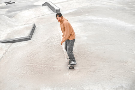 Teenager skateboarder boy with a skateboard on asphalt playground doing tricks.