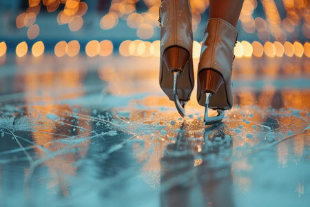 An artistic shot of a glowing ice skate placed on a reflective ice surface, complemented by soft bokeh lights in the background, evoking a sense of winter sport elegance.