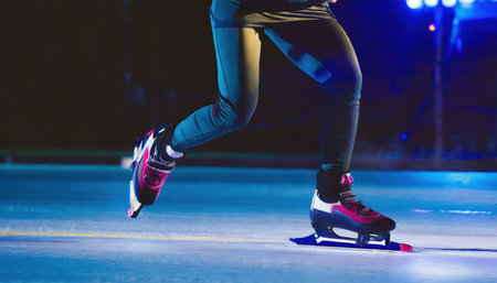 female legs in skates on ice, close-up, bokeh from lights