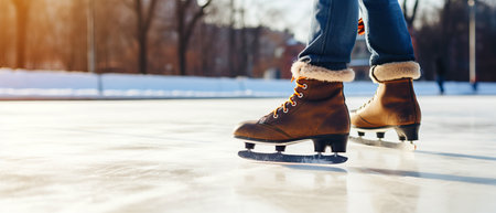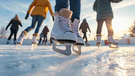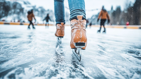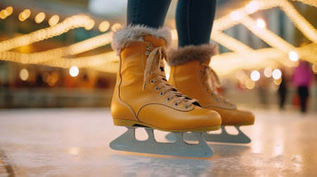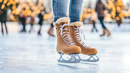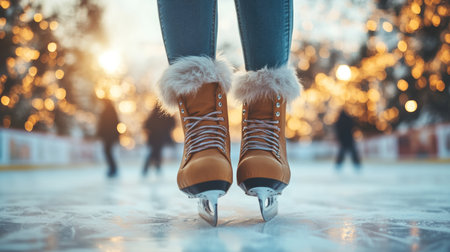 A captivating scene featuring vintage ice skates on a shimmering outdoor rink. Soft blurred lights create a magical winter atmosphere perfect for holiday joy.