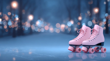 A pair of pink roller skates sits on a surface, likely indoors. The image features a shallow depth of field, with soft bokeh lights in the background. The lighting suggests a nighttime setting. It can be used for sports, leisure, or lifestyle concepts.