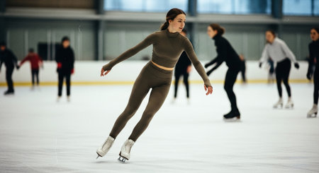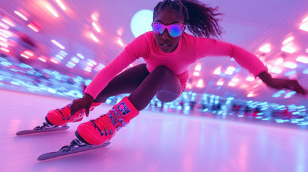 Young girl, athlete glides confidently across the ice, surrounded by bright, futuristic lights, focused on achieving victory
