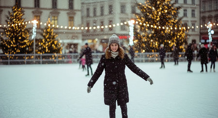 A young woman smiling on an ice skating rink during snowfall, surrounded by festive lights and Christmas trees