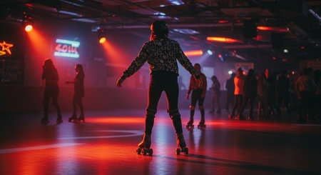 Classic roller skates on the rink floor with colorful lights in the background, ready for a fun night of skating