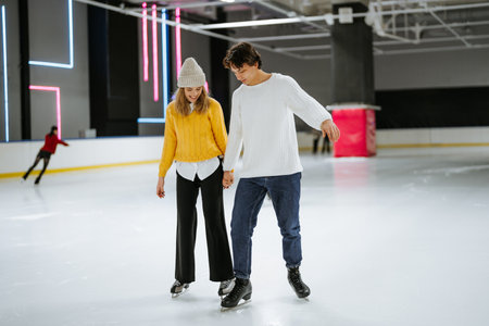 Young couple enjoying ice skating together in a modern indoor rink
