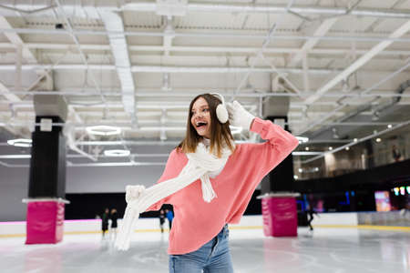 excited woman in ear muffs and pink sweater on frozen ice rink