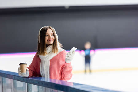pleased woman in white ear muffs and pink sweater holding paper cup and cellphone on ice rink