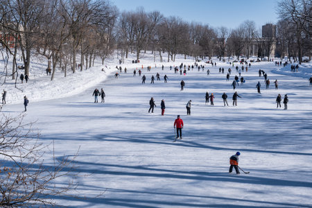 Montreal, Canada - 31 January 2021: People skating at Lafontaine Park natural ice rink