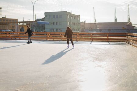 Two people skating on rink in skates. Winter sports, leisure, active way of life concept.