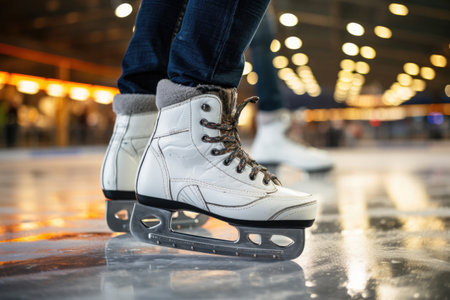 A captivating close-up view of a figure skater's white skates as they glide effortlessly over a beautifully maintained ice rink surface, showcasing the serene atmosphere of winter sports.