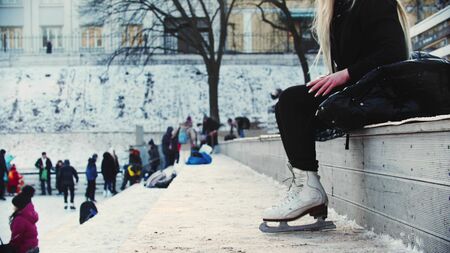 Skaters skating on iceskating ring in european city center in winter holidays. Kids playing on white ice skating ring, healthy activity. Child legs in black skates