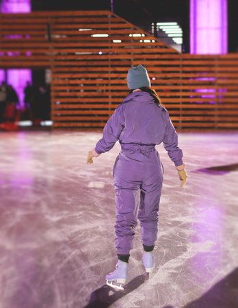 Girl skating on the ice rink arena with happy people around, concept of ice skating in winter, winter activities, holiday christmas time, with new year decoration and illumination