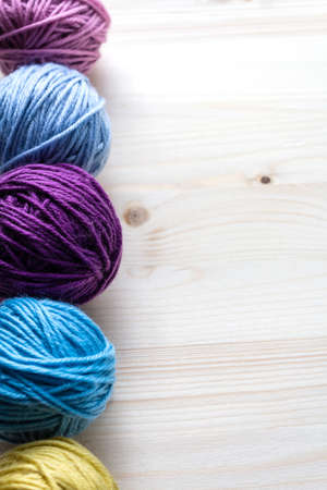 Multicolored woolen balls on wooden background. Vertical format with left border. Knitting as hobby. Purple, yellow and blue woolen tubes.