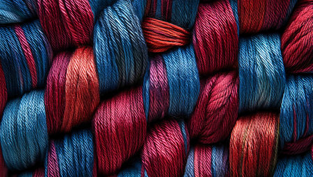 Colorful yarn skeins in warm lighting: red, blue, purple, and orange textures.