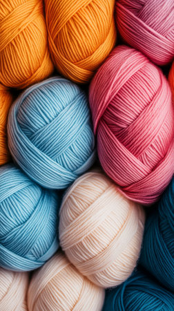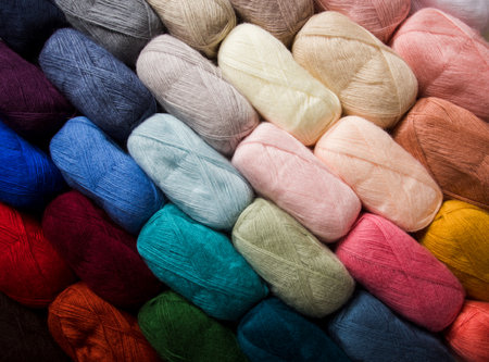 Vivid backdrop of yarn wool thread balls for knitting and crochet projects in gentle pastel shades