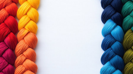 Brightly colored strands of yarn are beautifully arranged in a braid on a white background, perfect for craft and textile projects.