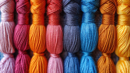Colorful yarn threads displayed in vibrant array close-up. That the image is generated using AI.