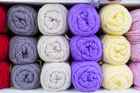 Knitting needles, colorful threads. Selection of colorful yarn wool on shopfront. Knitting background, a lot of balls. Knitting yarn for handmade winter clothes