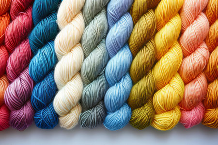 Close-up view of vibrant yarn spools showcasing a range of shades perfect for various crafting projects. Ideal material for creating textiles and accessories.