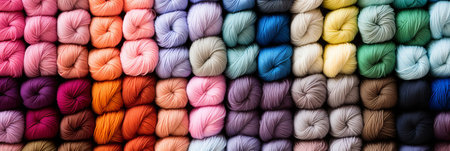 Vibrant yarn rolls creating a colorful background display of assorted threads and textures