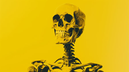 Skeleton on stairs, yellow background. Concept art, minimalism