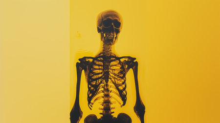A stylized illustration of the human skeleton, highlighting major bones in a vibrant color scheme, placed against a contrasting background for visual impact