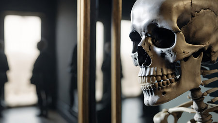A visually striking image of a human skeleton positioned against a dark background, showcasing the intricate structure of bones and joints