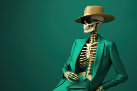Fashionable human female skeleton in stylish golden emerald clothes, glasses and a hat in trendy color combinations. With copy space. Glamorous skeleton model on a dark green gradient background.