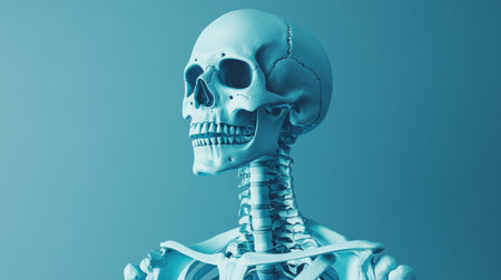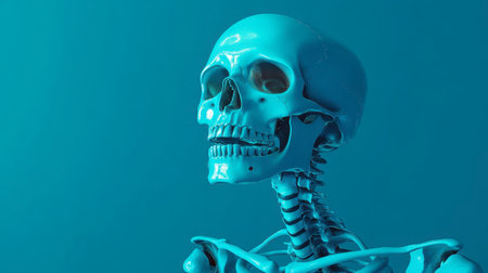 Realistic 3D rendering of a human skeleton with glowing blue effect, medical anatomy and osteology concept, empty space on blue background