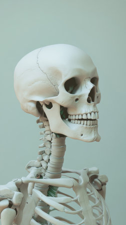 Detailed view of a human skeleton model showcasing the vertebral column and skull, perfect for educational purposes in medical and biology studies.