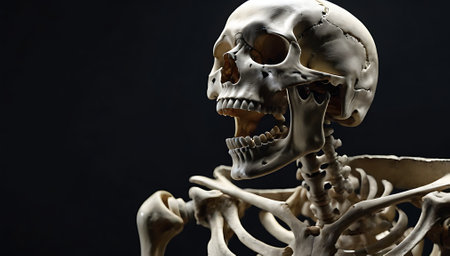 A visually striking image of a human skeleton positioned against a dark background, showcasing the intricate structure of bones and joints