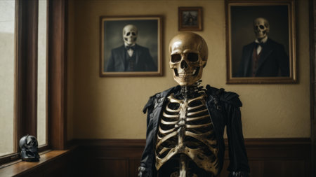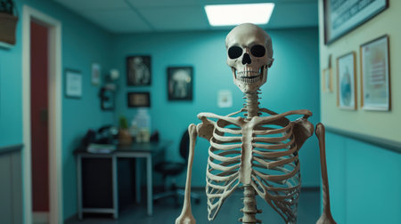 A skeleton posed humorously in doctor office, perfect for April Fools Day