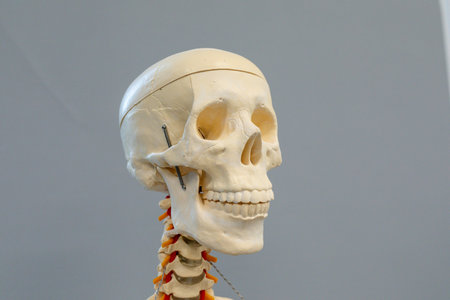 Human skull model close-up as part of anatomy educational set. Medical or biology teaching tool for students and professionals. Real photo