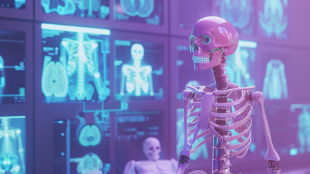 Stunning representation of a skeleton model featuring glowing effects in an abstract setting. Perfect for medical, educational, and scientific projects.