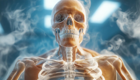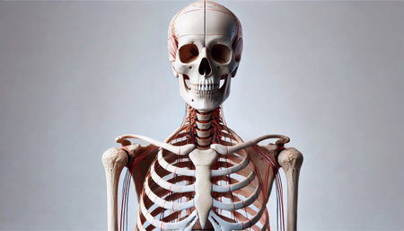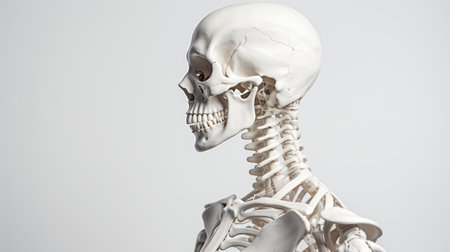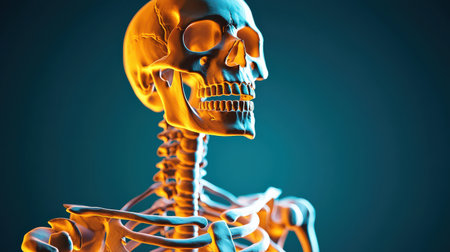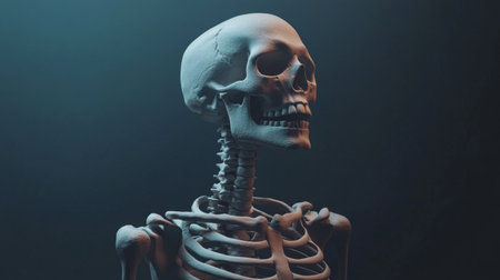 A detailed 3D model of a human skeleton showcasing anatomical features in striking lighting. Ideal for educational and artistic uses in various fields.