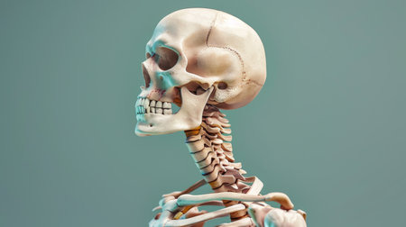An anatomically precise human skeleton focusing on the skull and upper limb bones, set against a smooth teal background?ideal for learning and medical showcases.