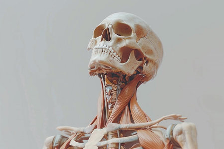 A detailed anatomical model of the human skull and neck muscles is displayed in a laboratory. The environment features cool tones and soft lighting, emphasizing the precise detailing of the subject.