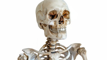 A smiling skeleton figurine with detailed bones on a clean white background, perfect for Halloween and spooky design themes.