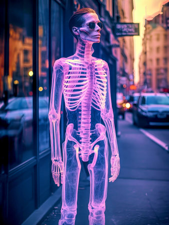 An AI generated illustration of A purple-hued silhouette of a human skeleton on a street