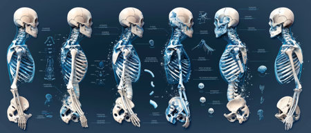 Human skeleton anatomy, 3d render, medical illustration, blue background